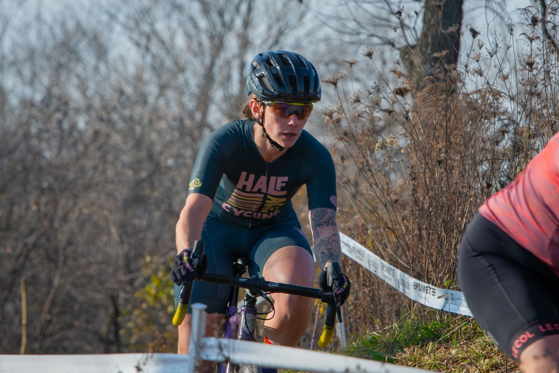 A woman is riding a bike in a race.